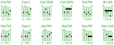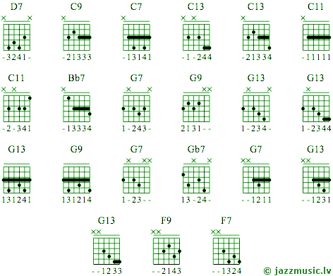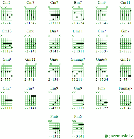 Informāciju par akordu uzbūvi var atrast šeit: Džeza akordi. Teorija.