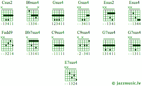 7) Susakordi (sus, sus2, sus4, 7sus4)