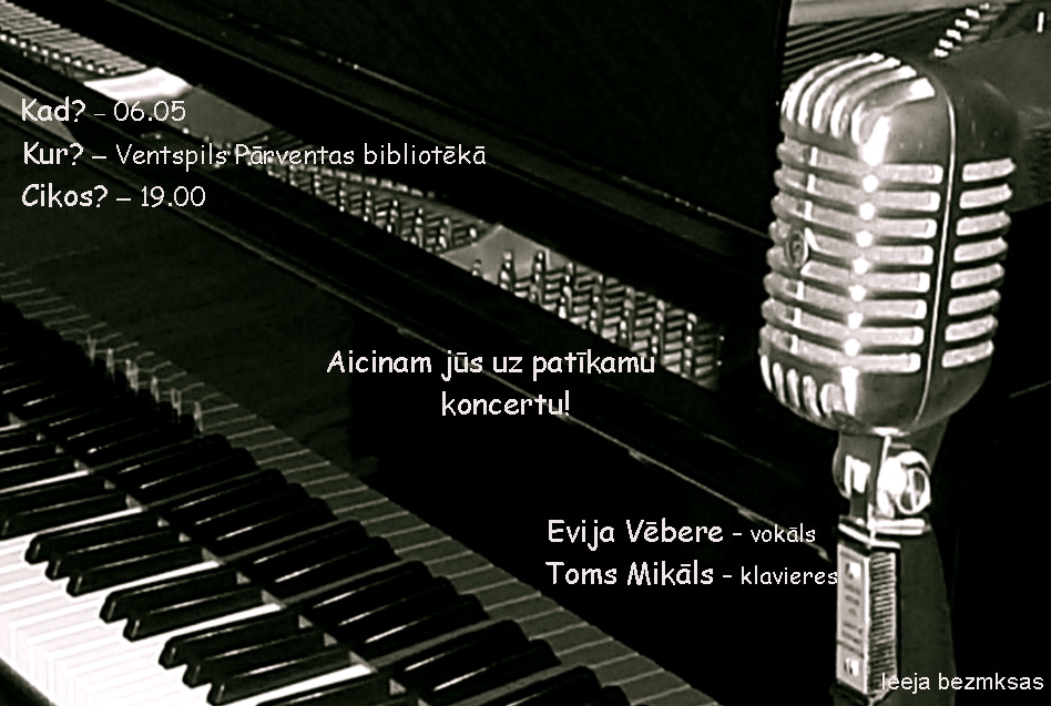Toms Mikāls un Evija Vēbere. Afiša Published 29/04/2011 at 948 × 637 in Evija Vēbere un Toms Mikāls uzstājas Ventspils Pārventas bibliotēkā ← Previous Toms Mikāls un Evija Vēbere. Afiša