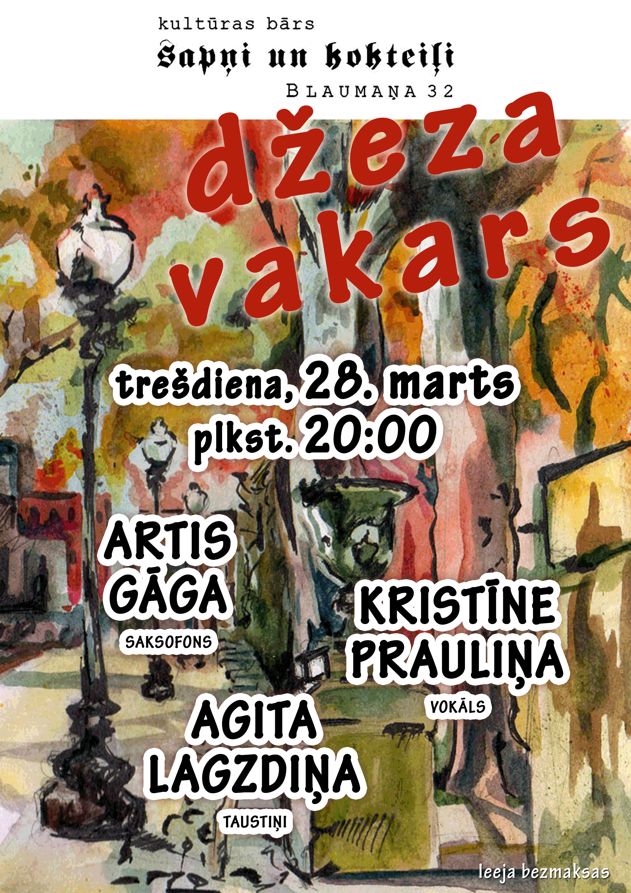 uzstāsies Kristīne Prauliņa (vokāls), Artis Gāga (saksofons) un Agita Lagzdiņa (taustiņi) Published 26/03/2012 at 2094 × 2961 in Arta Gāgas, Kristīnes Prauliņas un Agitas Lagzdiņas džeza vakars Next → uzstāsies Kristīne Prauliņa (vokāls), Artis Gāga (saksofons) un Agita Lagzdiņa (taustiņi)
