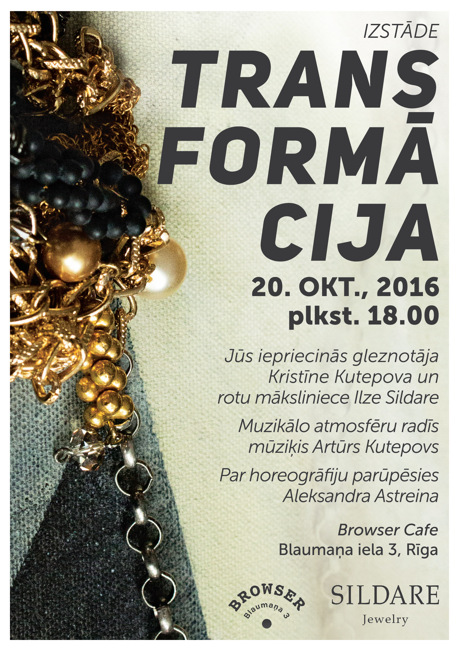 Divas Latvijas mākslinieces – zīmola «Sildare Jewelry» dibinātāja, rotaslietu dizainere Ilze Sildare un Ināras Teterevas fonda laureāte 2015, gleznotāja Kristīne Kutepova aicina 20.oktobrī uz kopīgo izstādi Transformācija. Pasākums norisināsies no plkst. 18.00 «Browser Cafe» Blaumaņa iela 3, Rīga.