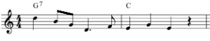 Izdomāt, nodziedāt un tad atkārtot nodziedāto uz sava instrumenta muzikālu frāzi, veidotu no divu akordu (G7 – C) skaņām.