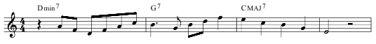Paskaidrojumi. Arī šajā gadījumā frāzi jāveido ar sajūtu, ka tā savieno šos akordus. Dziediet mazāk nošu, jums nav obligāti jāparāda visas akordu skaņas. Sākumā varat dziedāt tikai pamatskaņas, pēc tam pievienot tercas, kvintas utt. Akordu secību vēlams veidot četru takšu garumā, lai tā būtu simetriska. Viena takts – Dm7, otra takts – G7, trešā un ceturtā takts Cmaj7 akords.
