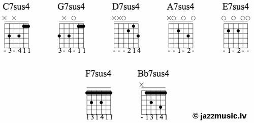 7sus4. Tas ir sus4 akords, kuram pievienota minora 7. pakāpe. Vairāk par akordu uzbūvi lasīt šeit: Džeza akordi. Teorija. 7sus4 akordus var izmantot gan dominantes septakordu (piemēram, C7), gan minora septakordu (Cm7) vietā, tādējādi iegūstot interesantu skanējumu.