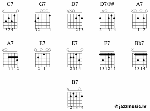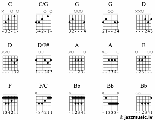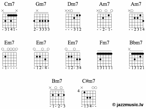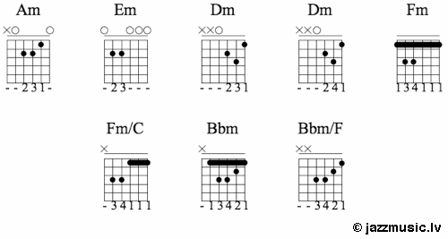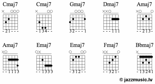 Ja vēlies vairāk akordu aplikatūras, ieskaties šeit: Džeza akordi ģitārai. Akordu aplikatūras.