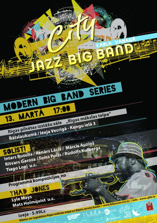 13. martā, plkst 17.00, Rīgas pilsētas izstāžu zālē “Rīgas mākslas telpa”, Kungu ielā 3, Kārļa Vanaga City Jazz Big Band aicina Jūs uz koncertu “Modern Big Band Series”. Programmā kompozīcijas no Thad Jones, Lyle Mays, Mats Holmquist u.c. Šajā koncertā Jūs priecēs instrumentālie solisti no visām bigbenda grupām un īpašais viesis Intars Busulis. Ieeja pasākumā 5,99 Ls (www.bilesuserviss.lv).