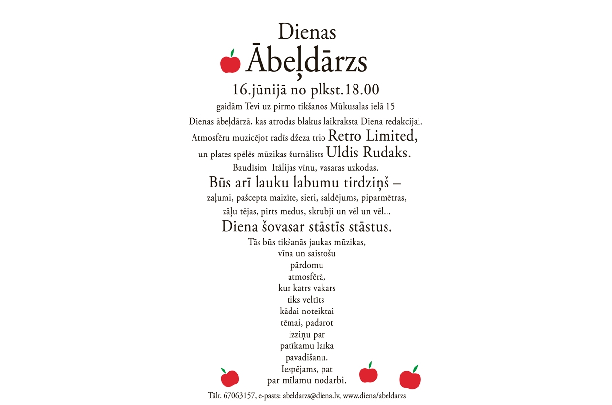 Dienas ābeļdārzs ir lieliska vieta – zaļa sala pilsētas vidū, kur turpmāk divreiz mēnesī rīkosim izklaidējošus brīvdabas burziņus sev, draugiem, saviem uzticīgajiem lasītājiem un ikvienam interesentam. Šovasar kopā – piecus.