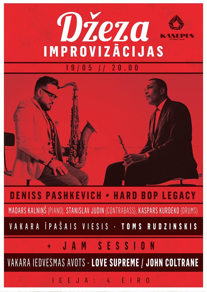Trešais projekta “Džeza improvizācijas” pasākums kopā lielisko saksofonistu Denisu Paškeviču un Hard Bop Legacy ( Madars Kalniņš – klavieres, Staņislavs Judins – kontrabass, Kaspars Kurdeko – bungas ).