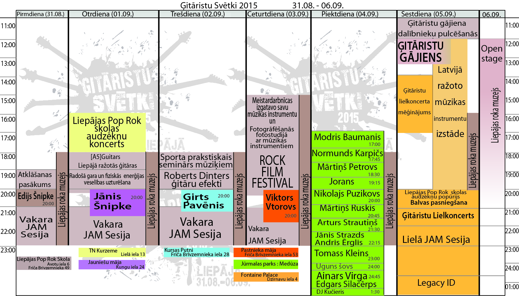 Tāpat kā pērn, tiks organizēts “Ģitāristu gājiens”. Sestdien, 5.septembrī, ģitāristi no visas Latvijas soļos pa Liepājas centrālajām ielām, lai pēcāk kopīgā mēģinājumā gatavotos vakara lielkoncertam. Bet visas dienas garumā būs unikāla iespēja apskatīt Latvijā ražotu mūzikas instrumentu izstādi, kurā piedalīsies arī tādi pazīstami zīmoli kā “JZ Microphones” un “Bro Creation”.